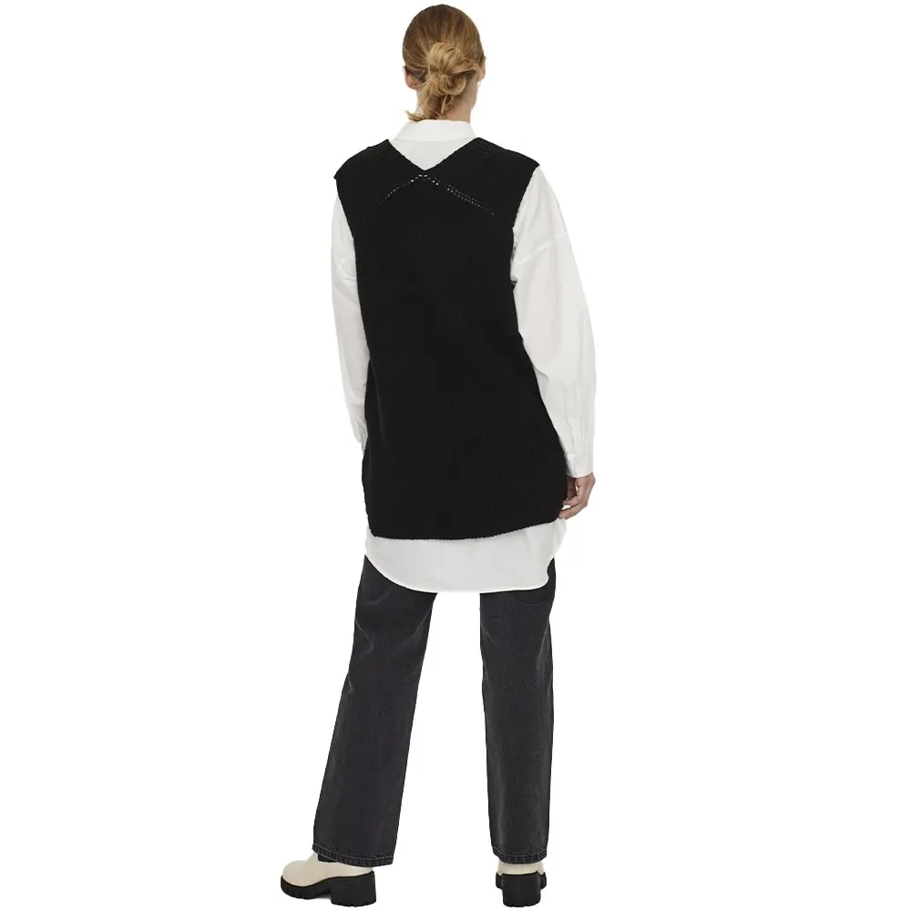Long, knitted vest with a v-neckline and slits on the sides. The vest is longer in the back. Style this vest with a simple shirt dress underneath, some sheer tights, and a chunky pair of boots for a stylish everyday look.